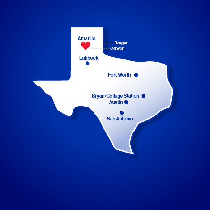 - Primary Trade Area — Potter, Randall, Hutchinson, Carson, Brazos, Tarrant, Travis Counties, SMSA.